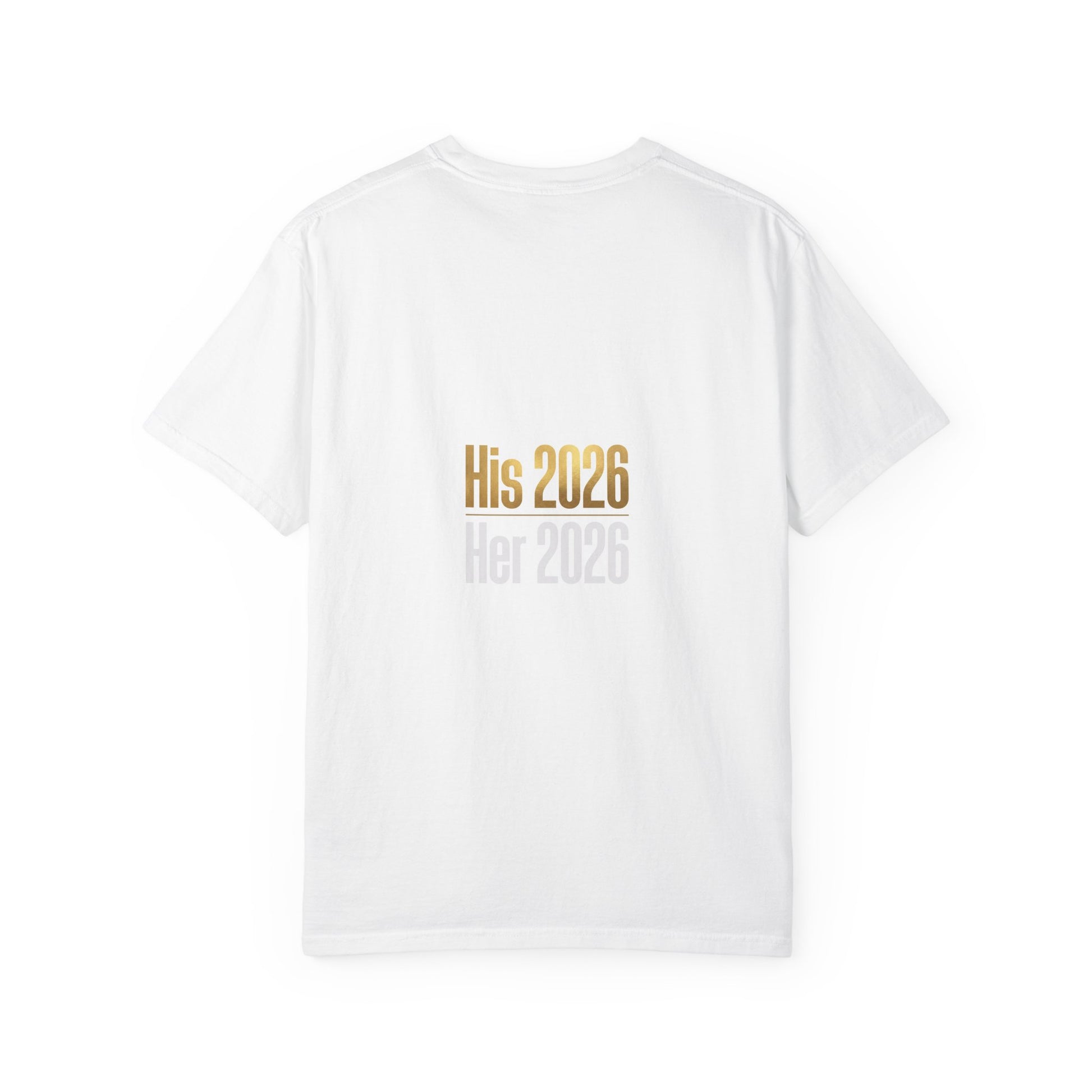 A relaxed, garment-dyed tee that carries a quiet, confident message. The soft, heavyweight cotton feels lived-in from the first wear, while the subtle two-line print — bold “His 2026” above a faded “Her 2026” — gives the shirt a vintage campaign-poster vibe without shouting. It sits comfortably in a casual wardrobe: paired with denim for weekend coffee runs, layered under a jacket at rallies, or worn around the house while planning and plotting bigger conversations. The muted colorway and pre-washed texture make the graphic feel integrated into the fabric, like a memory rather than a brand-new slogan. This tee is for people who want their values to show up in everyday moments — understated, honest, and built to last.