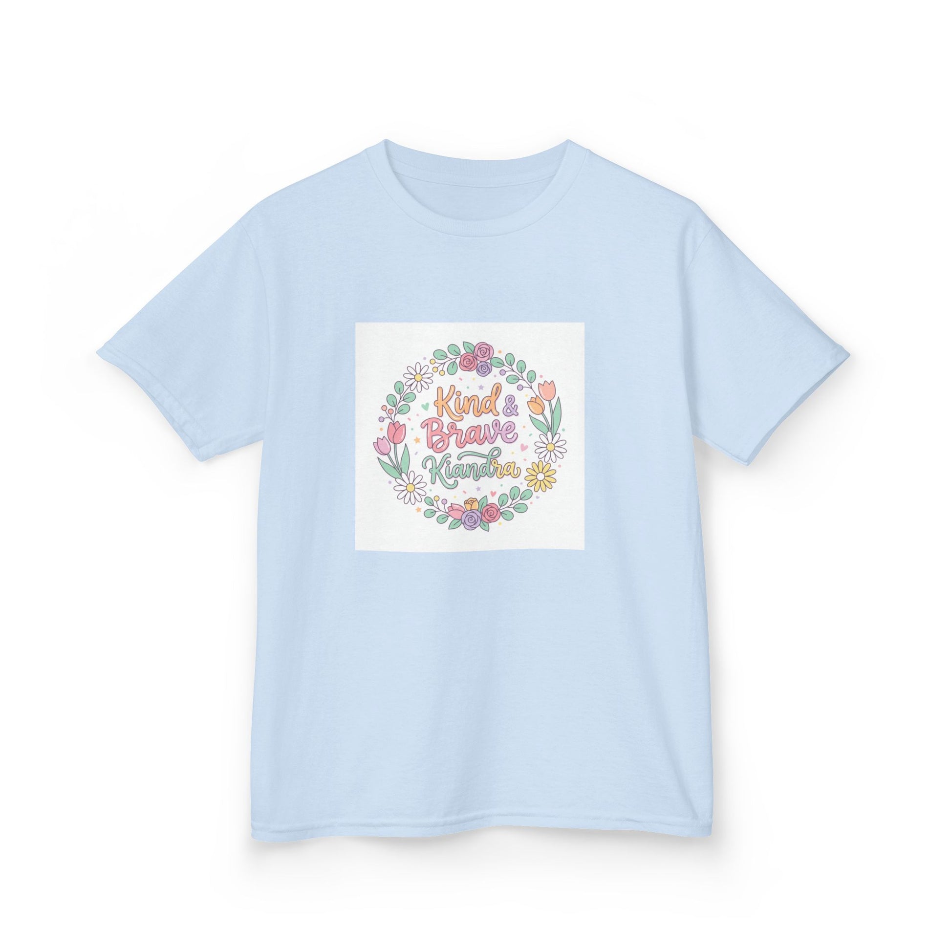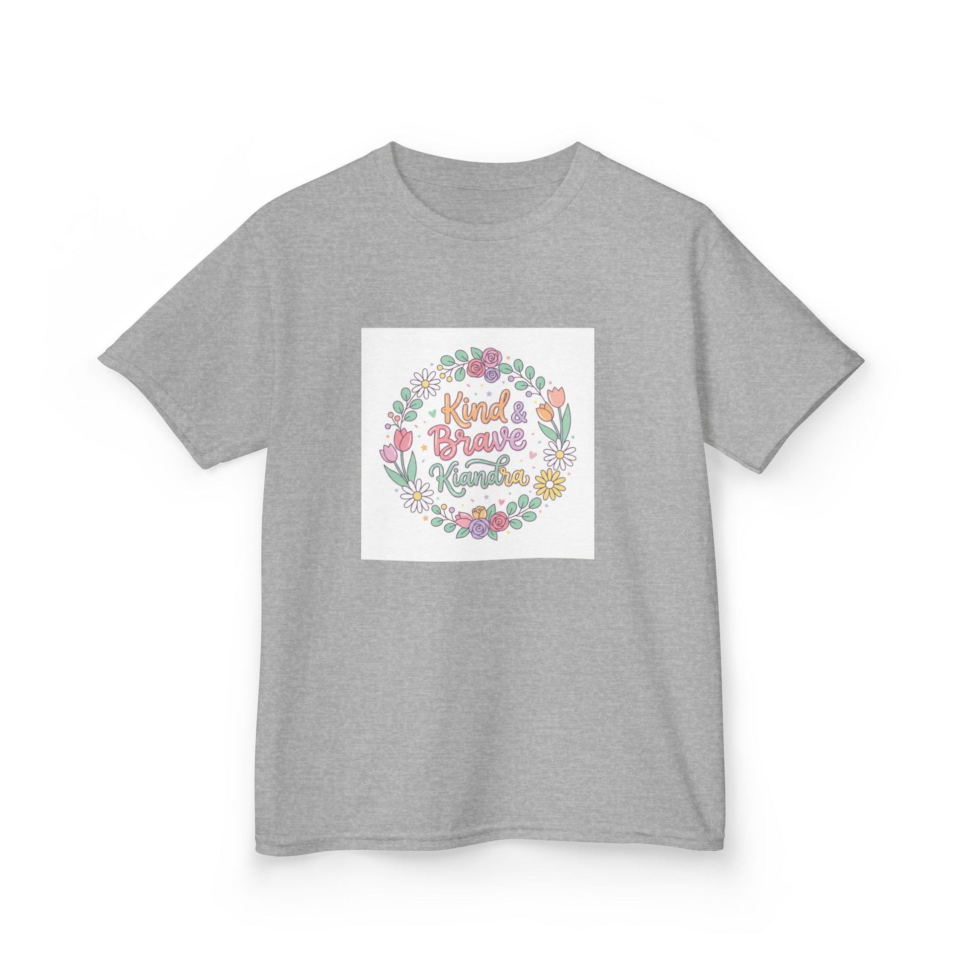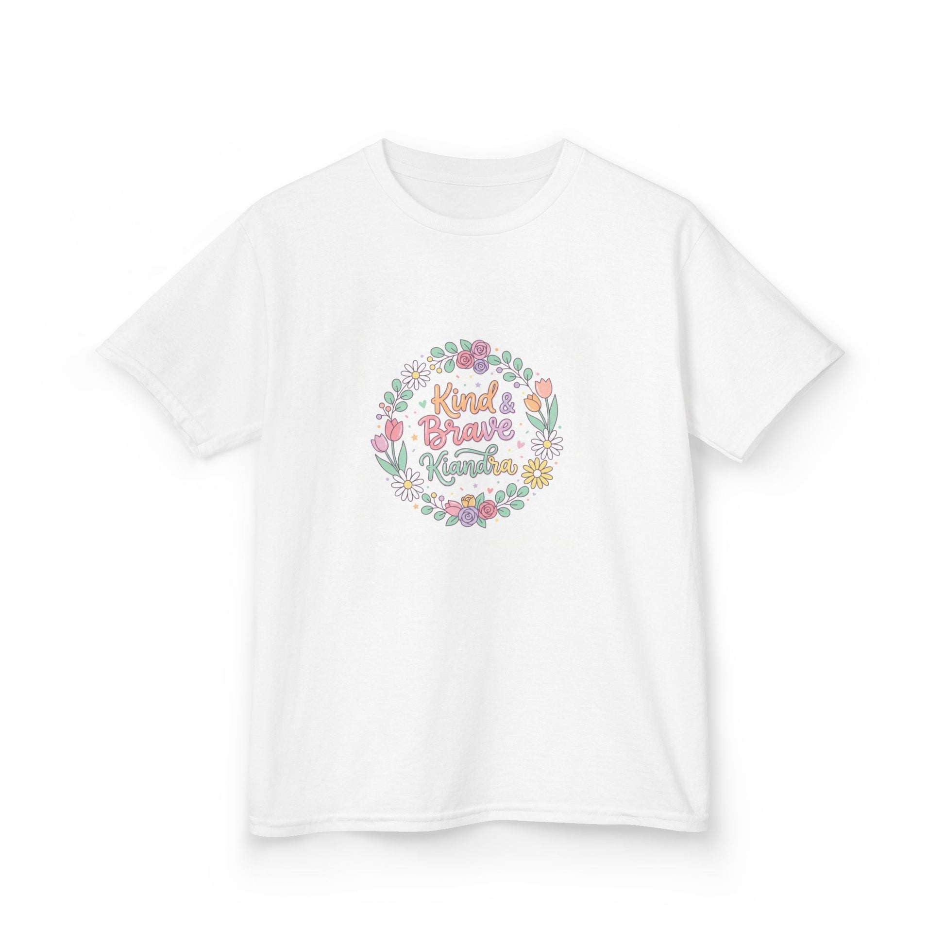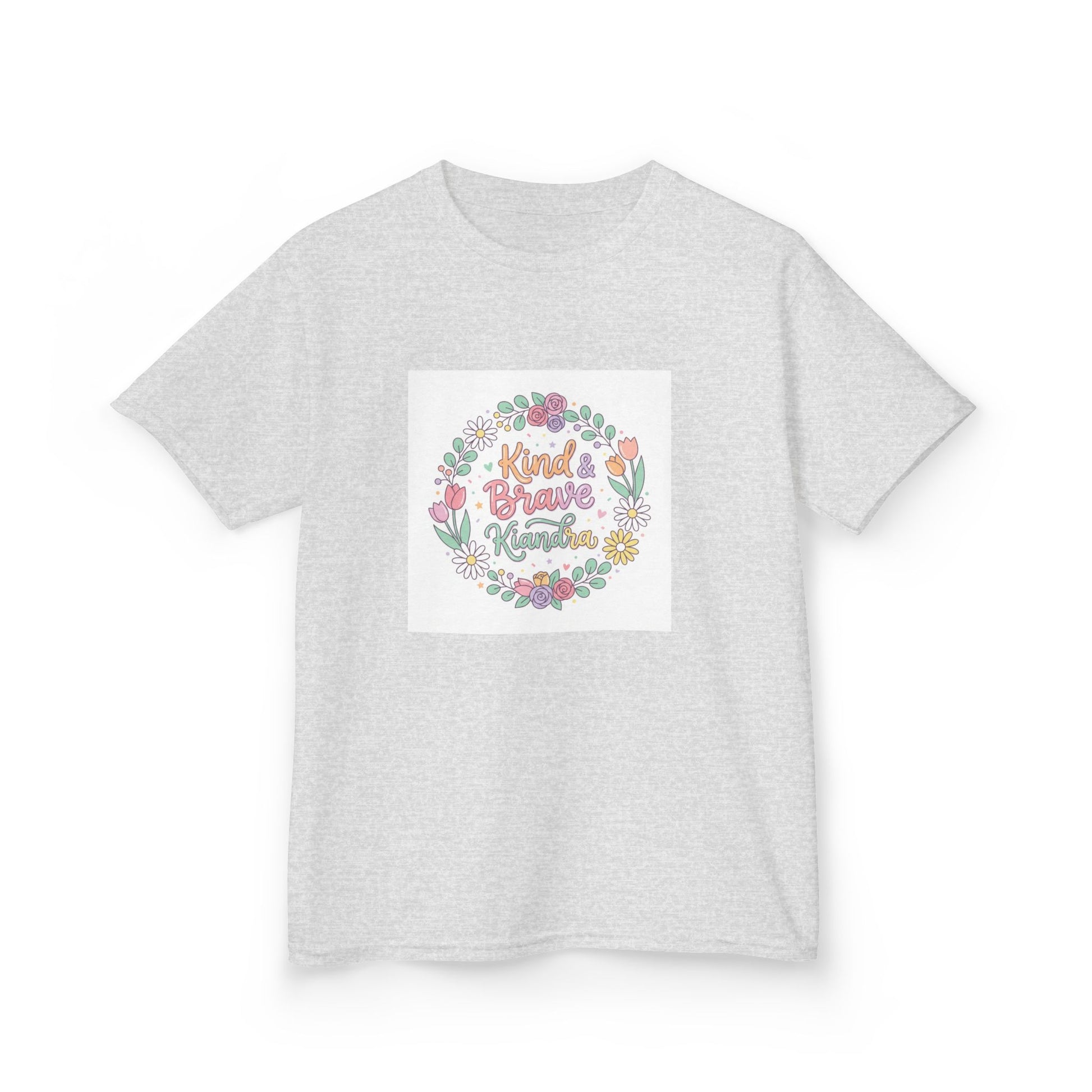 This soft, midweight kids tee carries a gentle, hand-drawn floral wreath and a warm message at its center. Lightweight but sturdy, it sits comfortably on playdates, family outings, and quiet mornings at home. The crew neckline and classic cut let little ones move freely while the pastel illustration keeps the look sweet and age-appropriate. Washed pastel colors and a subtle, centered print make it easy to layer under sweaters or wear alone on warmer days. It’s the kind of shirt that becomes a favorite — worn for school crafts, spring picnics, or when you want a little extra cheer in the day.