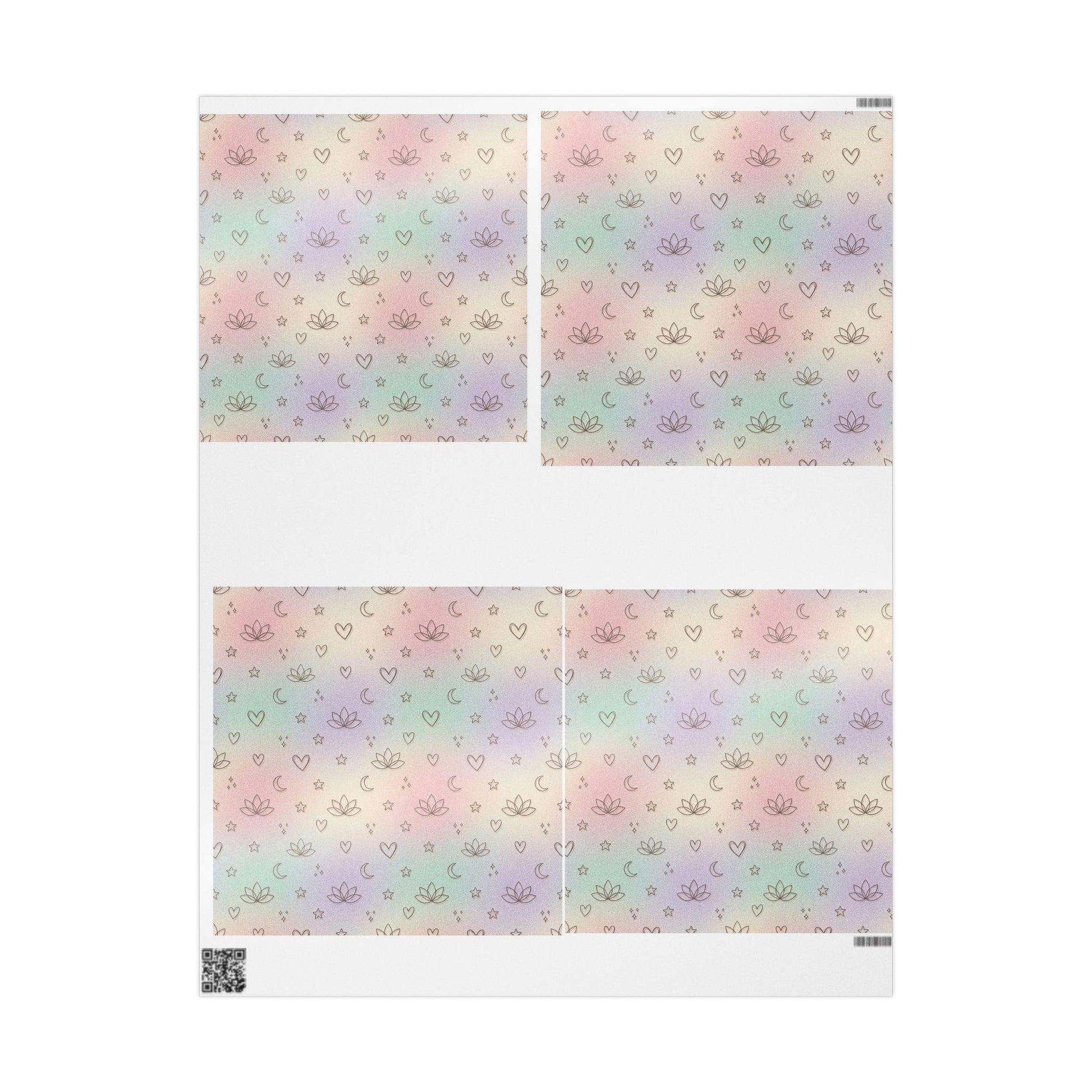 Soft, dreamy wrapping paper printed on 90 gsm fine art paper with a gentle pastel rainbow wash and delicate hand-drawn motifs — moons, stars, hearts, and tiny florals. The muted palette and whimsical doodles create a calm, cozy feeling that turns every present into a small, personal moment. Roll it out for birthdays, baby showers, or simply to brighten a handwritten note. The single-sided print keeps the design crisp and vibrant, while your choice of glossy or matte finish lets you choose either a soft, velvety look or a luminous sheen. Note: sheets include narrow white trim with a small barcode/QR panel at the edge.