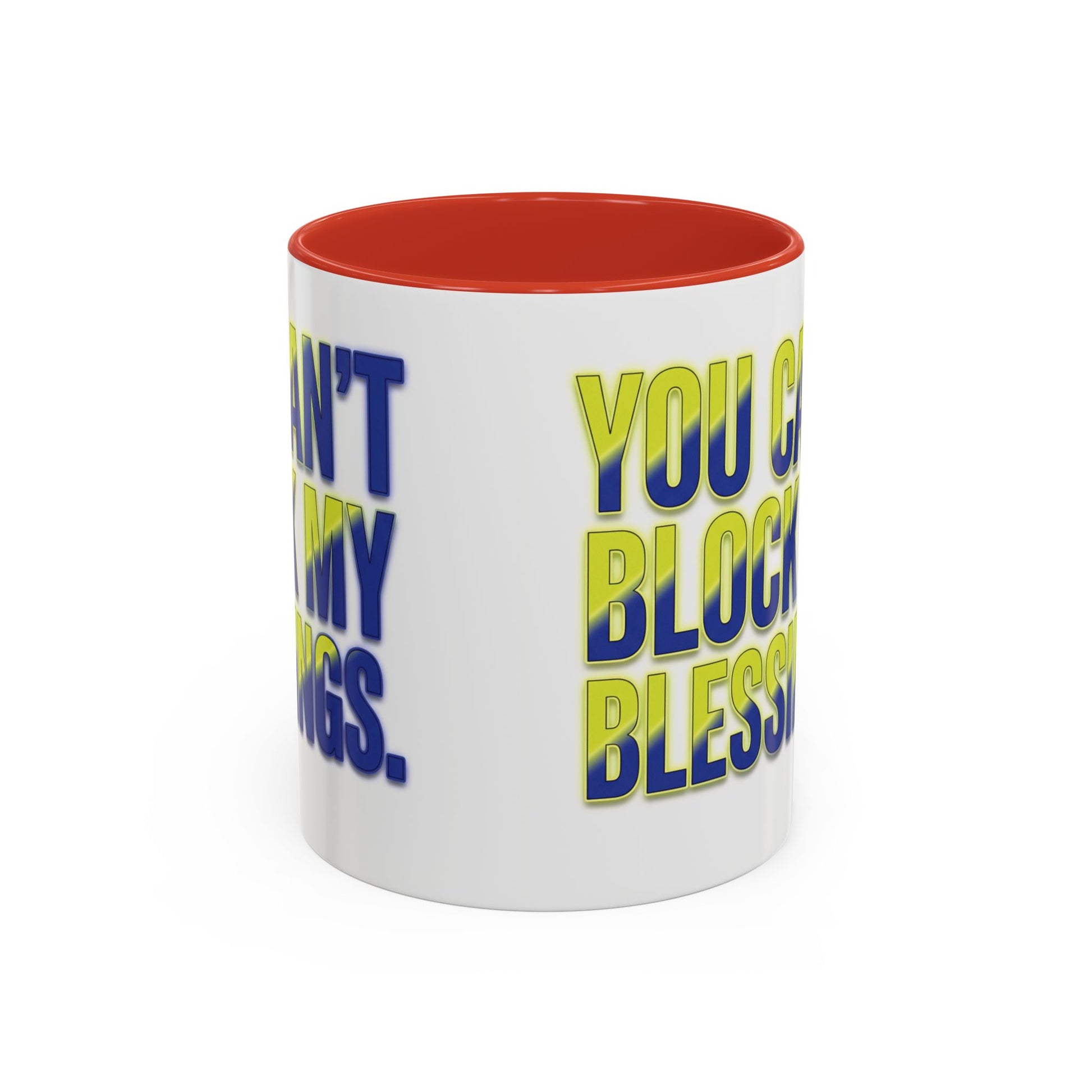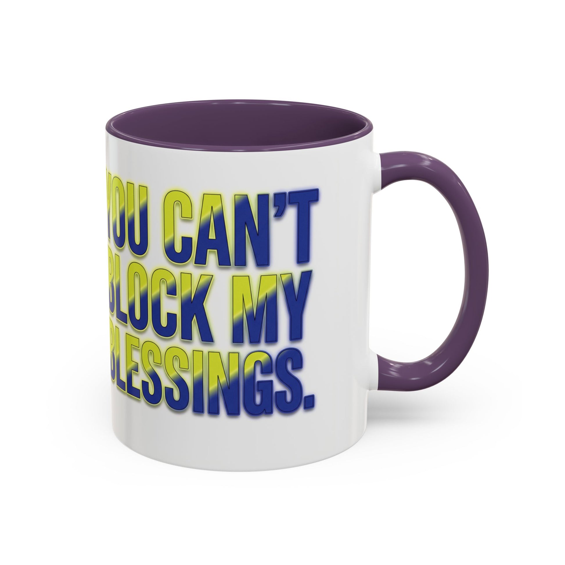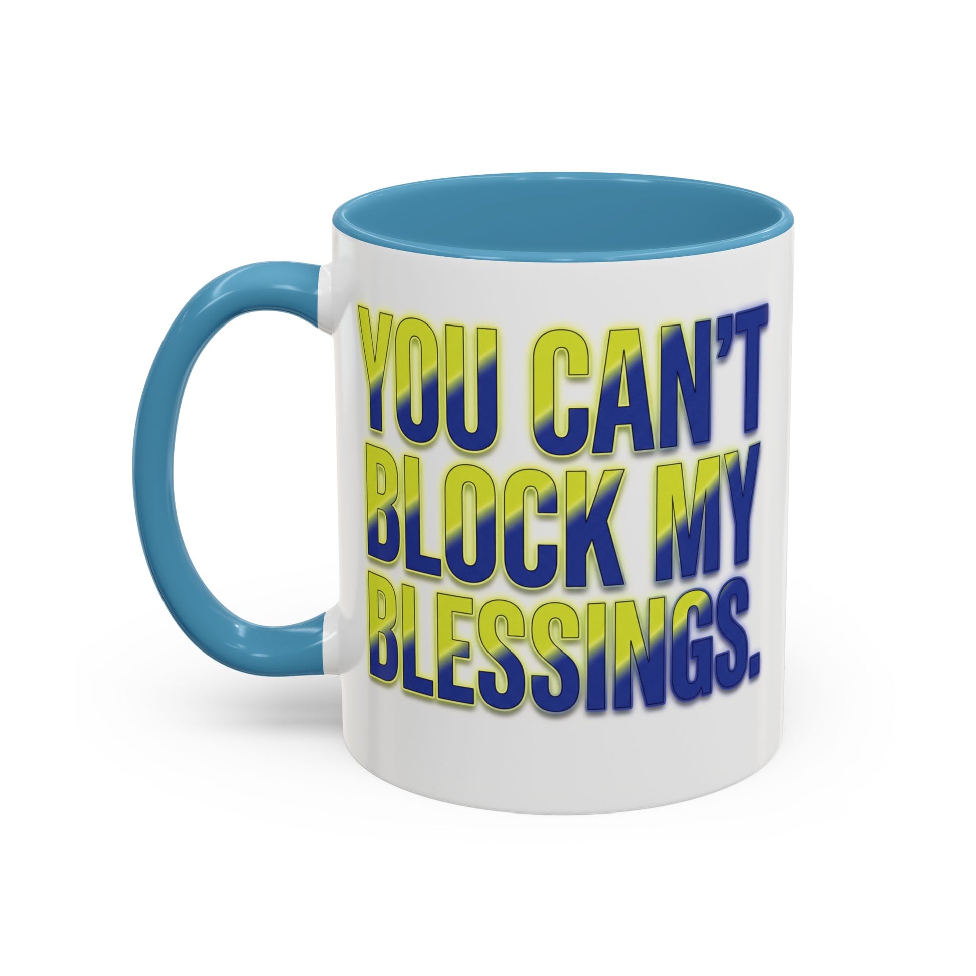 Sip your coffee with confidence and faith using this ‘You Can’t Block My Blessings’ accent mug. Available in 11oz and 15oz sizes, this mug features a bold inspirational message that reminds you daily that what’s meant for you is unstoppable. With a brightly colored accent handle and interior, it adds a stylish pop to your kitchen or workspace. Perfect for morning routines, office motivation, or gifting to someone who walks in purpose!"